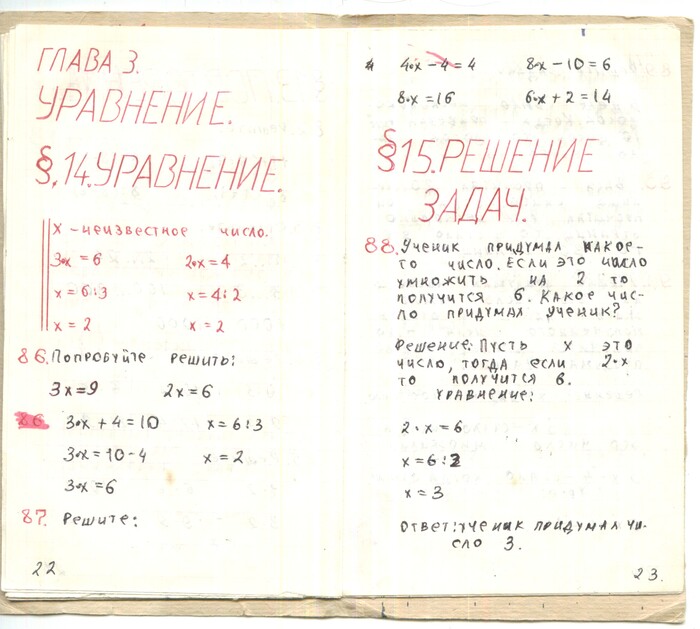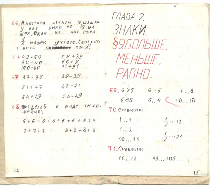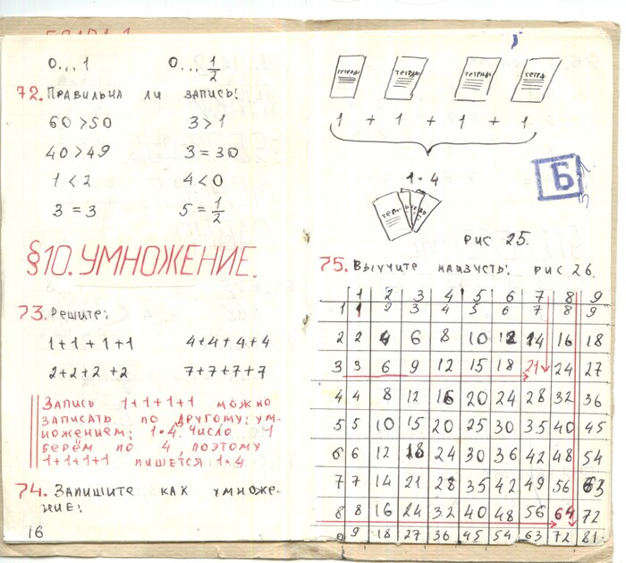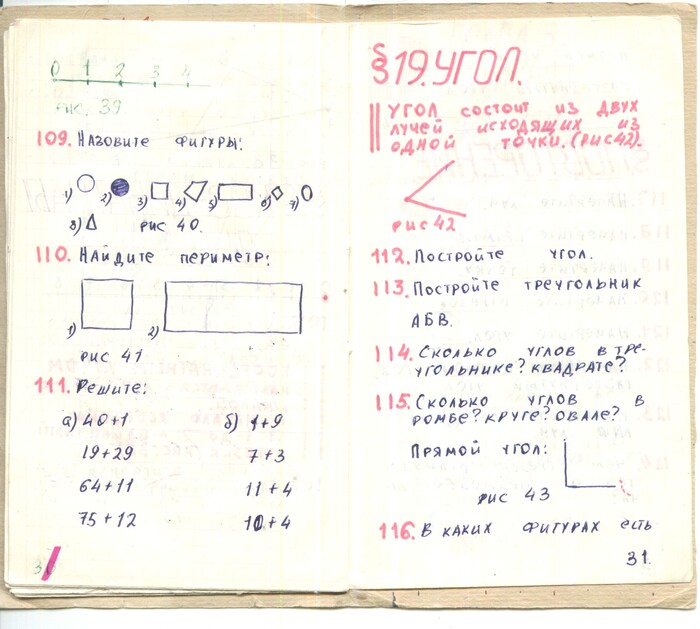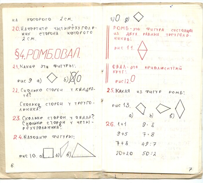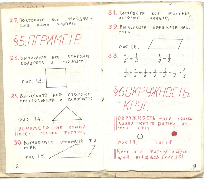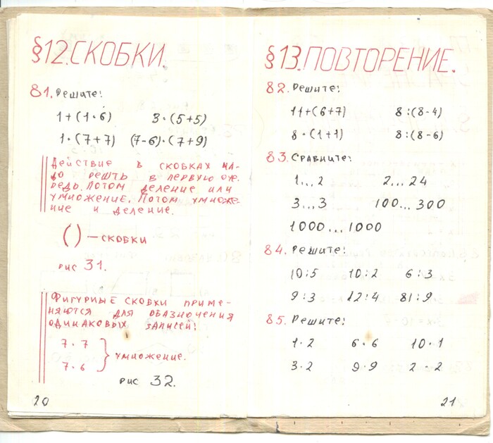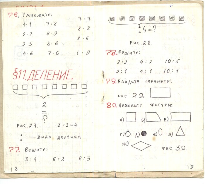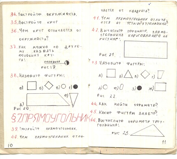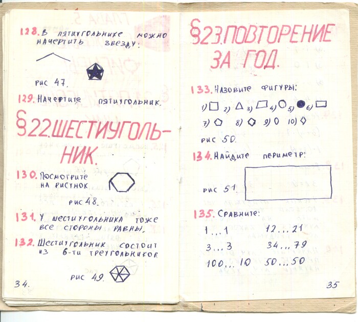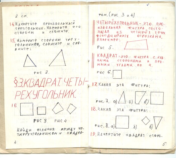 В учебнике темы разбиты на параграфы, есть примеры, есть задачи. Изучаются простейшие фигуры: треугольник, квадрат, ромб и т.д. Изучаются знаки сравнения и даже уравнения. Названия параграфов написаны с помощью трафарета - тогда это была крутая вещь.