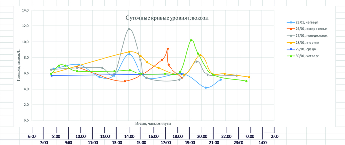 А что же у меня? Первые полчаса уровень глюкозы в крови растет, причем судя по углу наклона кривой с примерно той же скоростью, как и у здорового. Но рост этот не останавливается, и пик приходится на 60 после приема глюкозы. Абсолютные цифры достаточно высокие, но не катастрофичные (когда у меня впервые выявили диабет, стабильно натощак утром было больше - 14,5-16,5). Ну а дальше у меня падение, причем в первых двух случаях стремительное, с уходом в точке завершения теста (120 минут) в гипогликемию ;-)