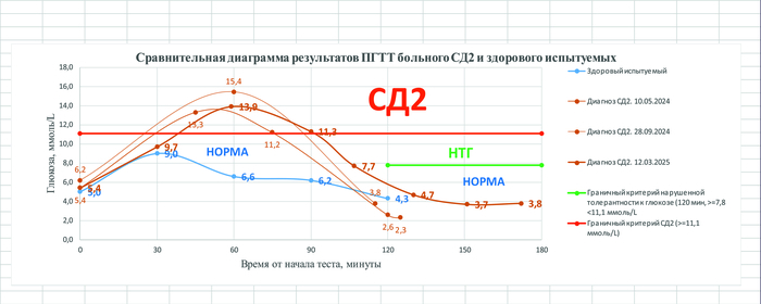 Приветствую, друзья, коллеги "по несчастью", случайные прохожие! Как и анонсировал, публикую сравнительную диаграмму результатов перорального глюкозотолерантного теста (далее ПГТТ) здорового человека и обладателя официального диагноза СД2, т.е. вашего покорного слуги, он же @Alabandine.