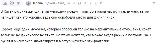 Разницу ребята видите? Плевать какая внешность, достаток и прочее. Она же уверенна шо всех наших баб китайцы с радостью расхватают. А мужики, нищеброды которым не дают, мечтают что БАБЫ место освободят (страшно же выгнать) и тогда они пригласят филиппинок за миску риса. Потому что он нищеброд и так далее. Вот это ребята любовь к себе, вот это уверенность и уважение к противоположному отечественному полу.
