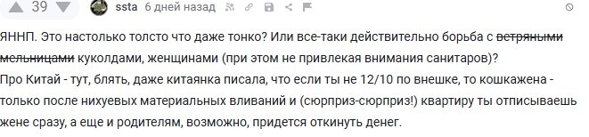 Надо будет ещё отдельно поговорить просто о бабулесах наших мужчин и китайских девах, а точнее отношение к ним. Но это уже в 4 части.