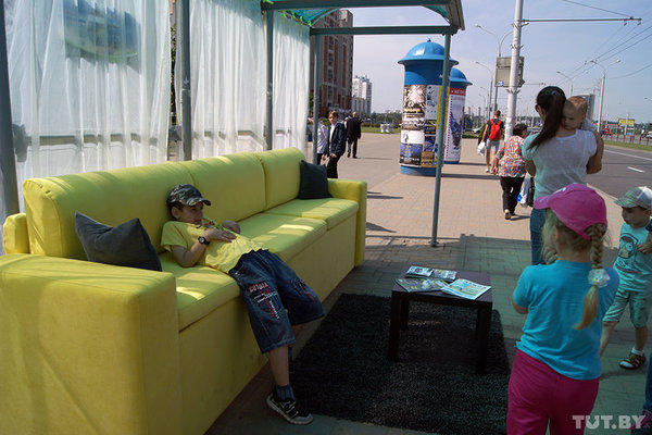 Сегодня утром остановка общественного транспорта станции метро "Уручье" заметно преобразилась. Вместо обычной лавки тут установили яркий диван с подушками, повесили шторы, а рядом постелили коврик и поставили журнальный стол. Зачем создали такую удобную остановку и как долго все это простоит — в материале TUT.BY.