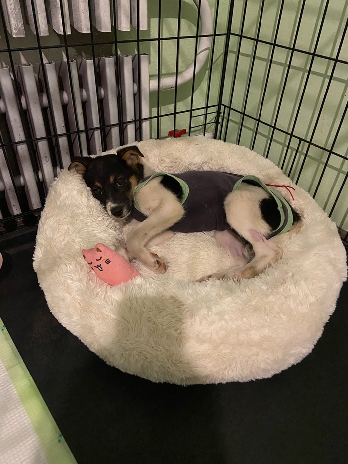 Щенкам повезло, мимо шла женщина. Но забрать малышей у нее не было возможности, поэтому она принесла щенков в коробке к ветеринарной клинике и оставила там. Получается «подкинула». Ей было очень стыдно так поступать, но она сказала, что нет возможности забрать. Понятное дело, щенки эти тяжело.