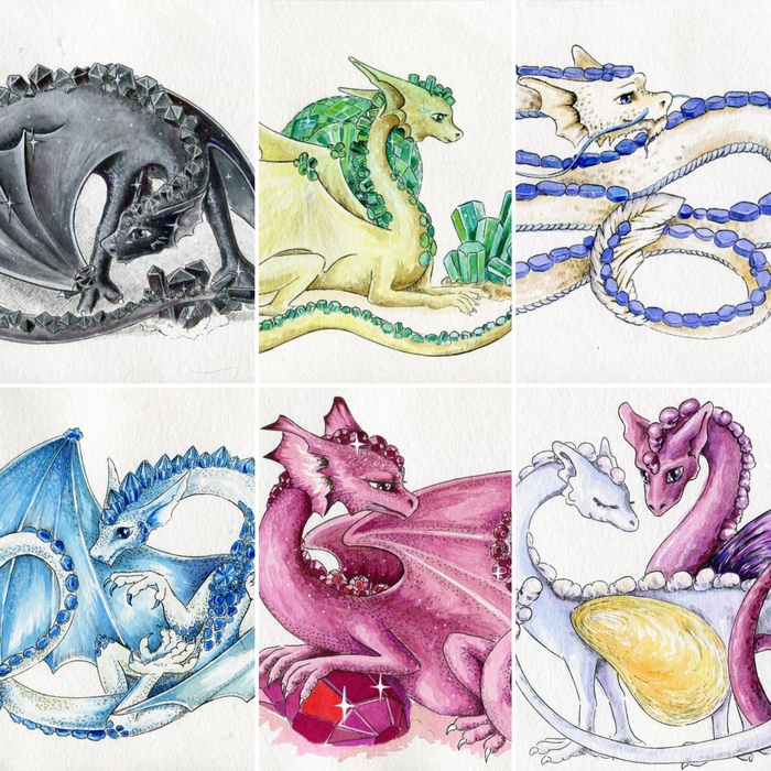 В позапрошлом году я рисовала дракончиков, связанных с ботаникой, и меня попросили сначала сделать с ними открытки, а потом и календарь. В этом году захотелось нового и были созданы дракошки-драгоценные камни. И календарь с ними почти готов :) Вот, делюсь превьюшечками к нему :)