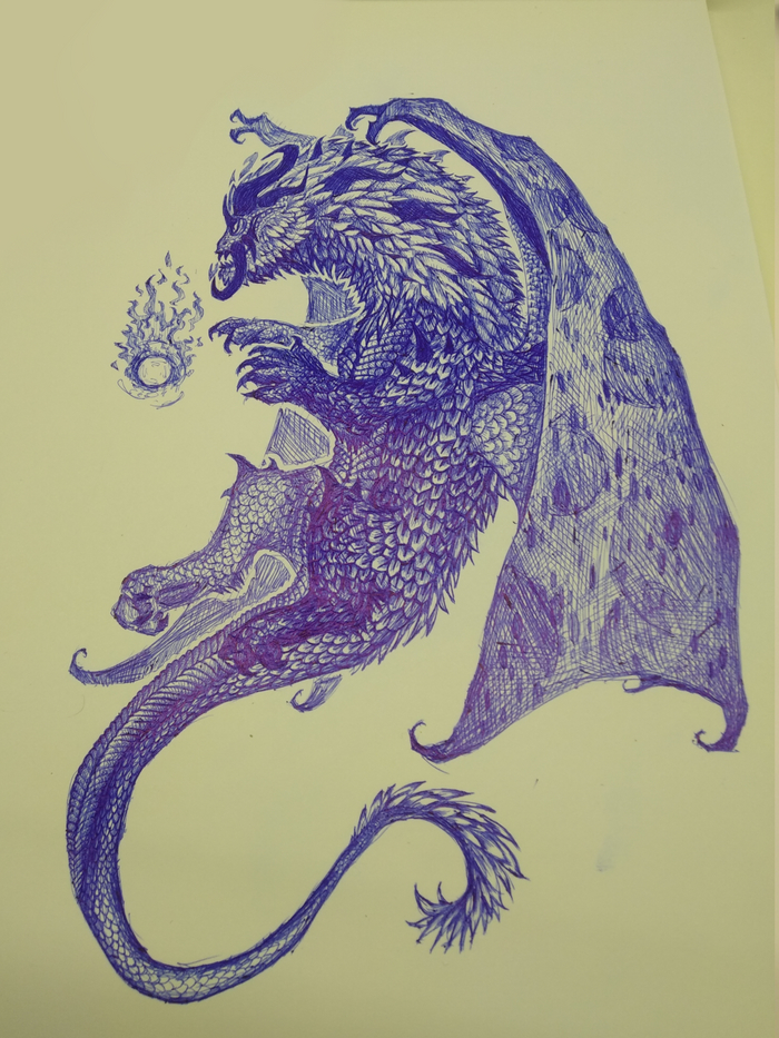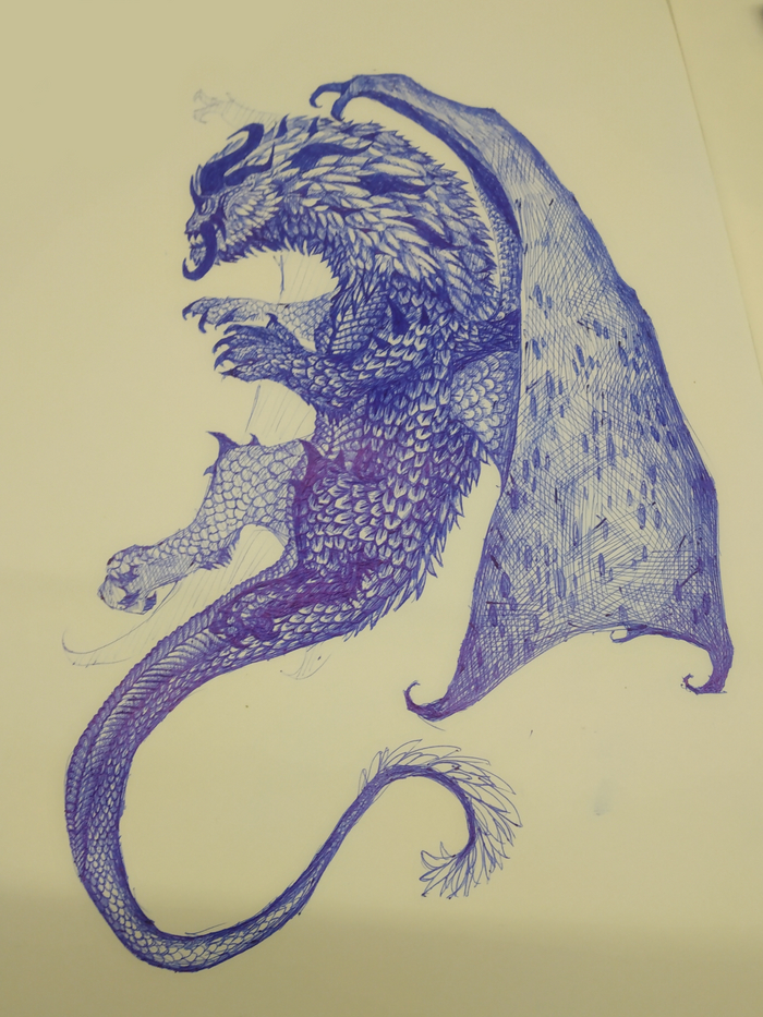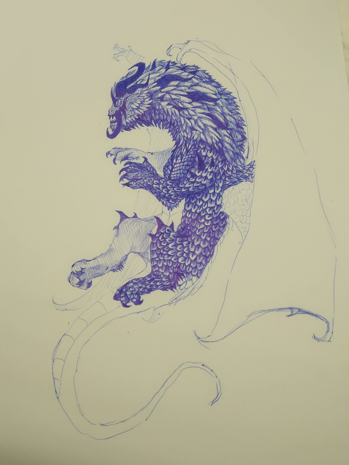 Как ни лень мне было делать крылья, оставить так я их не могла. Тогда, собравшись с духом, я решила рискнуть всем рисунком и начать делать пересекающиеся штрихи. Моя попытка, как ни странно увенчалась успехом, и тогда я совсем расхрабрилась и наделала ему пятнышек.