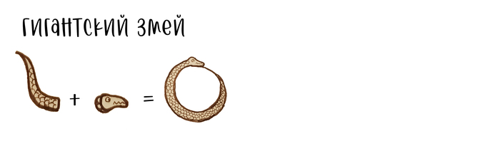 Так как все драконы – в основе своей – змеи, то головушка с хвостом – неизменные атрибуты. И даже их название происходит от латинского термина draconem, что означает «огромный змей»; от древнегреческого δράκων, drákōn (родительный падеж: δράκοντος, drákontos), что означает «змея», «гигантская морская рыба». Поэтому можем считать – что гигантский змей – это тоже в каком-то смысле дракон, в древних источниках часто сложно понять, что конкретно имеется в виду, так как змеями называли всех драконов. И строго говоря, этот анализ следовало бы начинать именно с этой формулы, как изначальной, но тогда было бы очень долго добираться до привычных нам драконов.