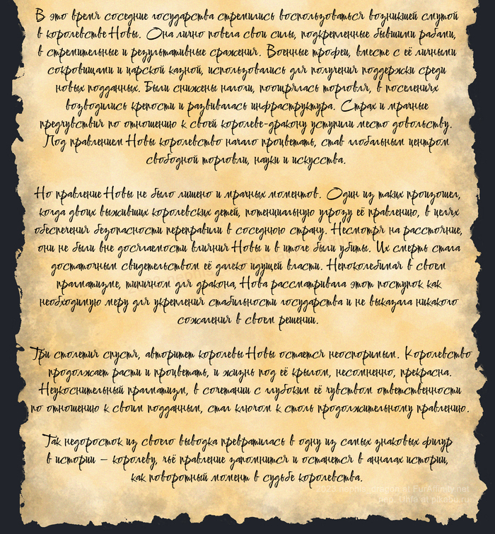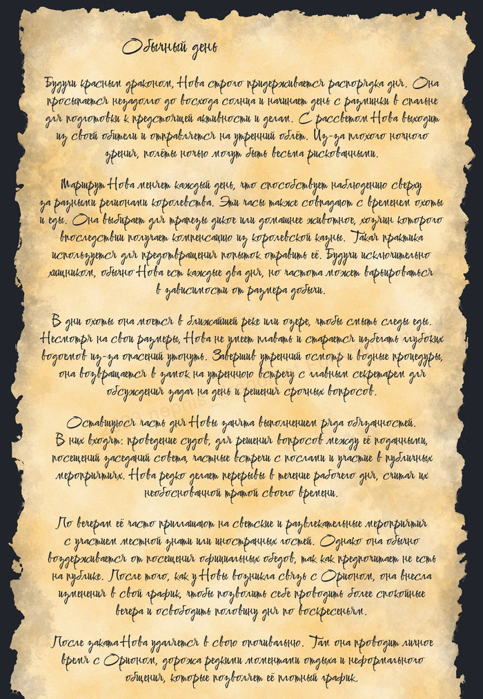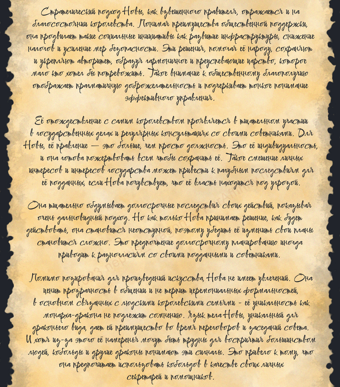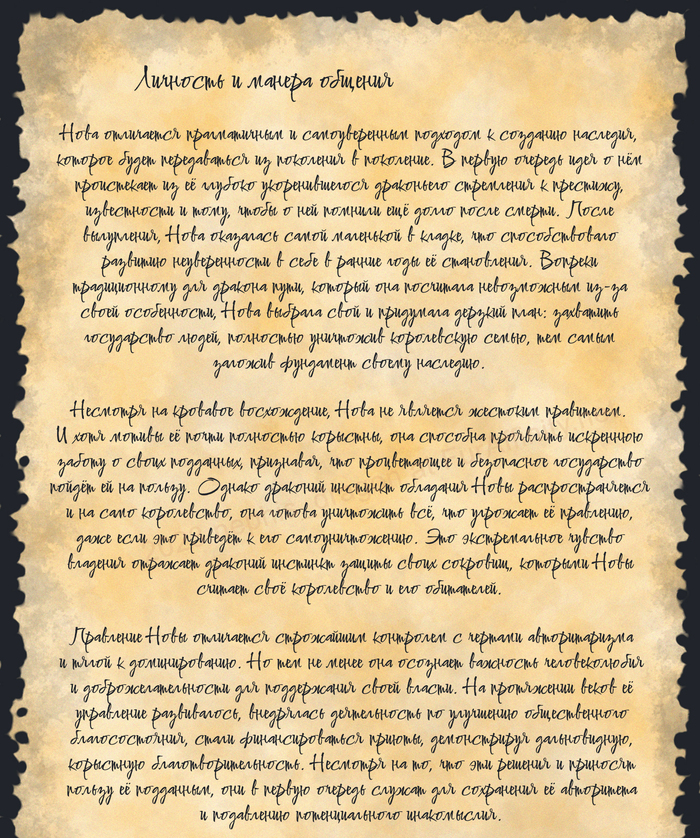 Нова, красный дракон — правящий монарх человеческого королевства, которое она заполучила в результате насильственного захвата власти. Отличаясь авторитарным стилем управления, она использует стратегию тщательного прогнозирования и корыстного человеколюбия, но в конечном итоге это приносит пользу её подданным. Несмотря на суровое правление, королевство сохраняет свою мощь и процветает под неустанным надзором, и непревзойдённым руководством. ©