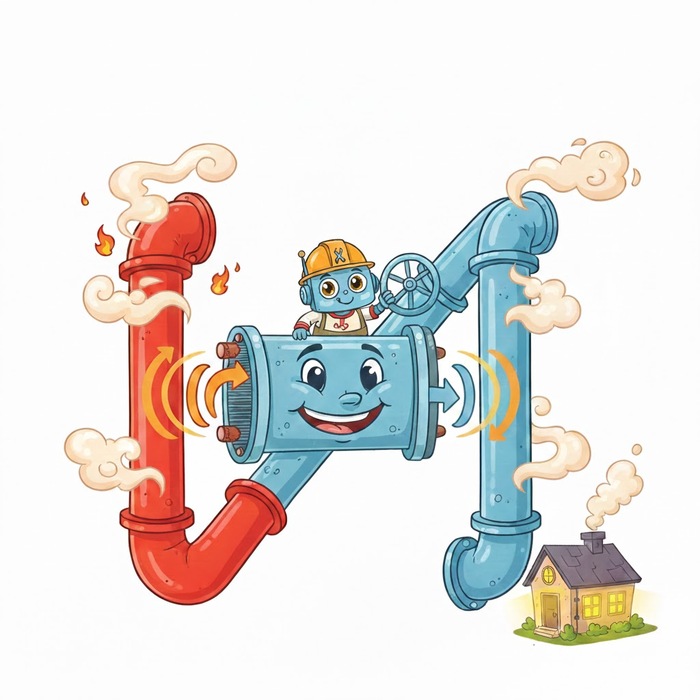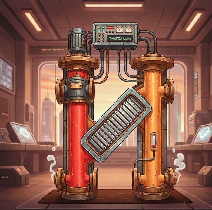 Ну а все, кто ближе должны на местах занижать параметры воды в сети. И происходит это как раз на тепловом пункте. При помощи устройства с названием теплообменник, регулируемой арматуры с электроприводом и автоматики.Происходит это примерно так: в теплообменник поступает перегретая сетевая вода и через тело теплообменника отдаёт свое тепло воде контура внутреннего, не зависящего от сетевого.Т.е. на входе в теплообменник стоит у нас клапан и он открыт, процесс теплообмена идет, внутренний контур греется. За его температурой следит термодатчик. А автоматика бдит. В неё зашито сколько должна быть температура. (Например 60°). Контур греется - 10, 20, 30, 40, 50, 60, 62. Автоматика дает сигнал и клапан закрывается, сетевая вода перестает греть внутренний контур и тот остывает: 62, 61, 60, 59, 58. Алярм! говорит автоматика, дает сигнал, клапан открывается, процесс теплообмена возобновляется.И так в вечном колесе сансары.