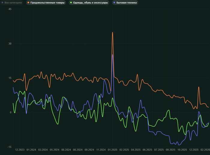 В СберИндексе рисуют устойчивое снижение по основным категориям: продовольствие, бытовая техника, одежда. Спрос на последние уже год непрерывно снижается в денежном выражении, т.е. даже без учёта инфляции.