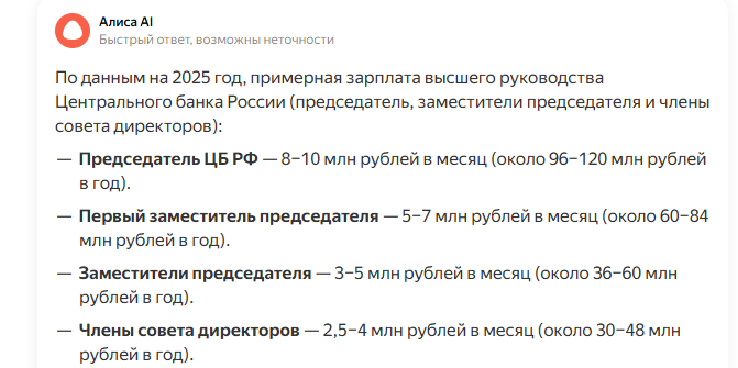 По мнению главы ЦБ, высокая инфляция является следствием перегрева спроса среди населения, видимо мы слишком много потребляем. Хотя средняя зарплата в России на 2025 год была около 100.000 рублей в месяц, ЗП главы ЦБ исчисляется 10 миллионами рублей в месяц.