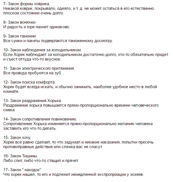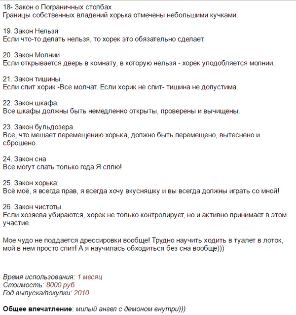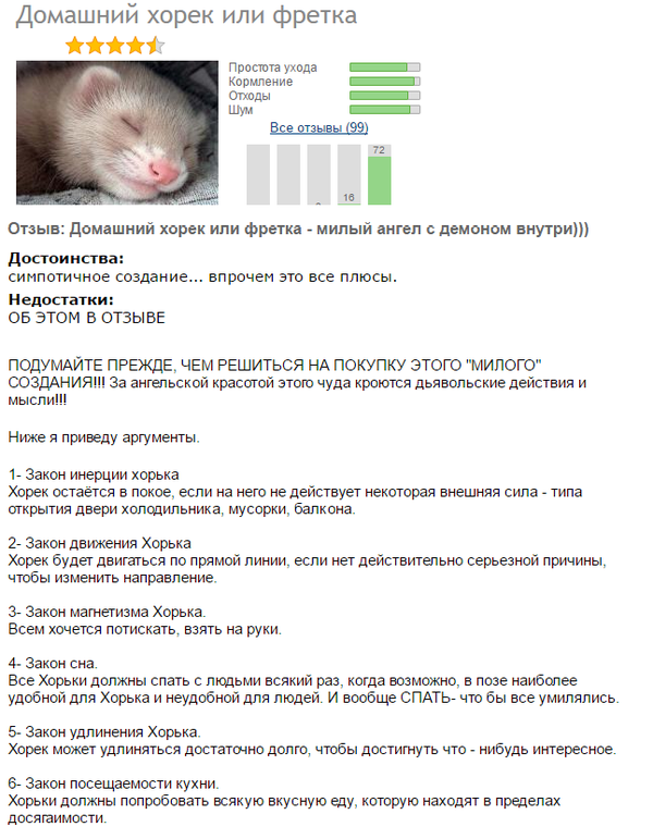 255 Loko11 Хорьки Законы хорьков 8 лет назад Решил завести себе хорька, и начал знакомиться с отзывами опытных хозяев, наткнулся на сей шедевр: П.С. Хорька брать не передумал) Показать полностью 3 Хорек Отзыв Закон Длиннопост
