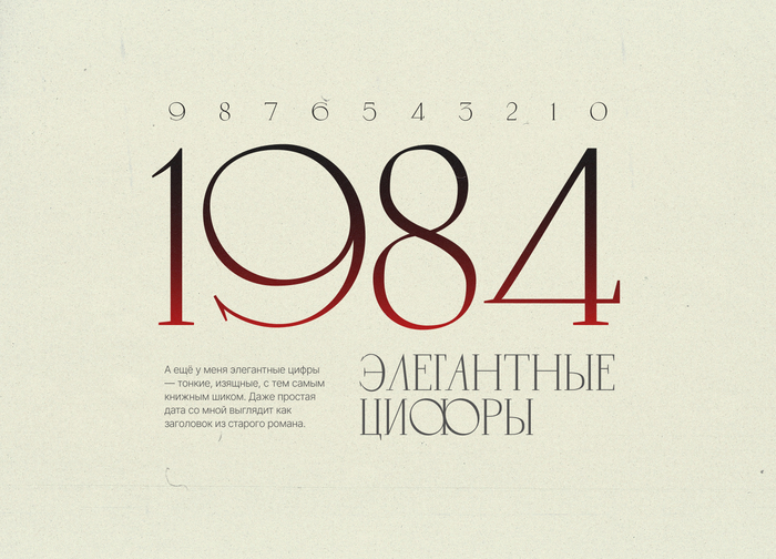 Во мне живёт дух книги и искусство буквы. Я — элегантный, с утончёнными засечками и характером, вдохновлённым классикой 60-х. Меня любят за литературную атмосферу и тонкий стиль.Хочу быть на страницах, где важен смысл, форма и вкус. И да — у меня шикарные цифры.Меня создала: Alena Krachkovskaya