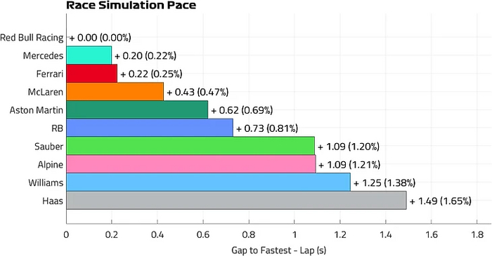 Однако, основываясь на данных, собранных во время тестов, «Феррари» совершила гигантский скачок и теперь отстает от «Ред Булл» примерно на две десятых в гоночных симуляциях, что является значительным улучшением по сравнению с прошлым годом. Похоже, что на одном круге они немного сдали, но по этому показателю они все равно уступают те же две десятых.