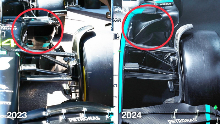Задняя подвеска – одно из самых больших изменений. Мы видели, как нам казалось, новейшую систему «Мерседеса» на «Астон Мартине», которая использует коробку передач и заднюю подвеску как часть клиентской сделки, и эти сравнительные снимки прошлогоднего «Мерседеса» с версией 2024 года подтверждают, что он перешел на систему толкателей (выделено красным) и встроил много защиты для устойчивости болида в геометрию задней подвески на верхнем рычаге (выделено темно-зеленым) передней опоры внутреннего крепления.