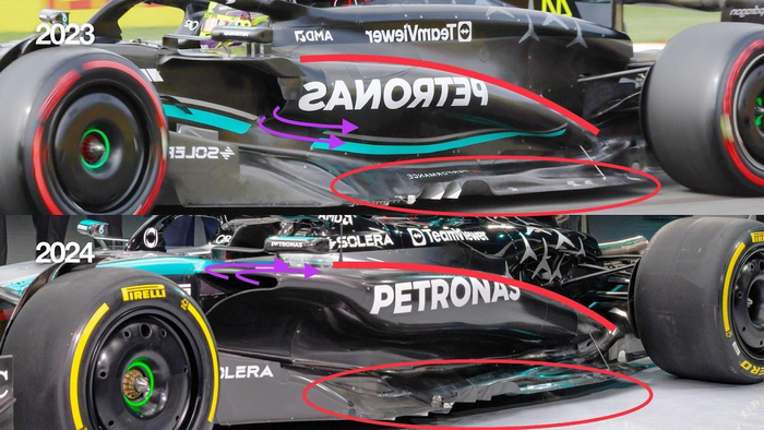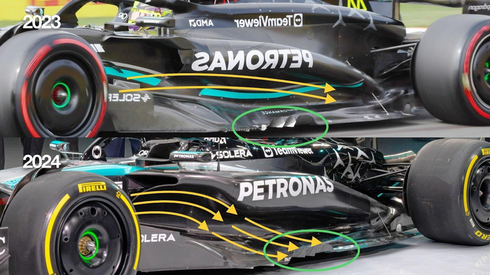 Автомобили «Феррари» 2022 и 2023 годов были гораздо более луковицеобразными (светло-желтый эллипс) в этой области, резко вытесняя воздушный поток наружу через край днища. Большинство других команд, которые мы видели до сих пор в 2024 году, приняли этот луковичный подход, но «Феррари», похоже, пошла в противоположном направлении.
