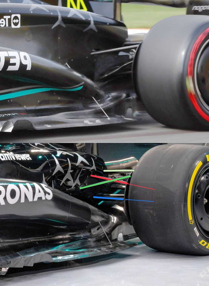 Это сравнение показывает, что «Мерседесу» удалось добиться такого зазора между закрылками на передней кромке, сделав нос немного короче (зеленый эллипс), и тем самым отделив нижнюю часть носа от самого переднего элемента переднего крыла.