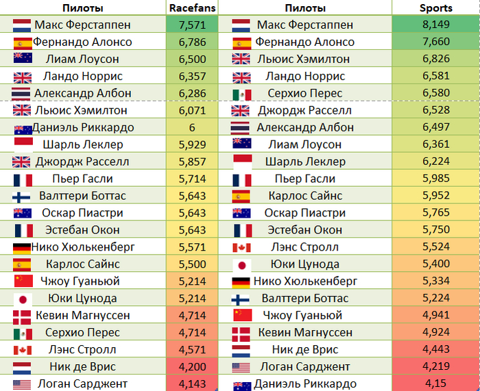Сравнение оценок с Racefans: