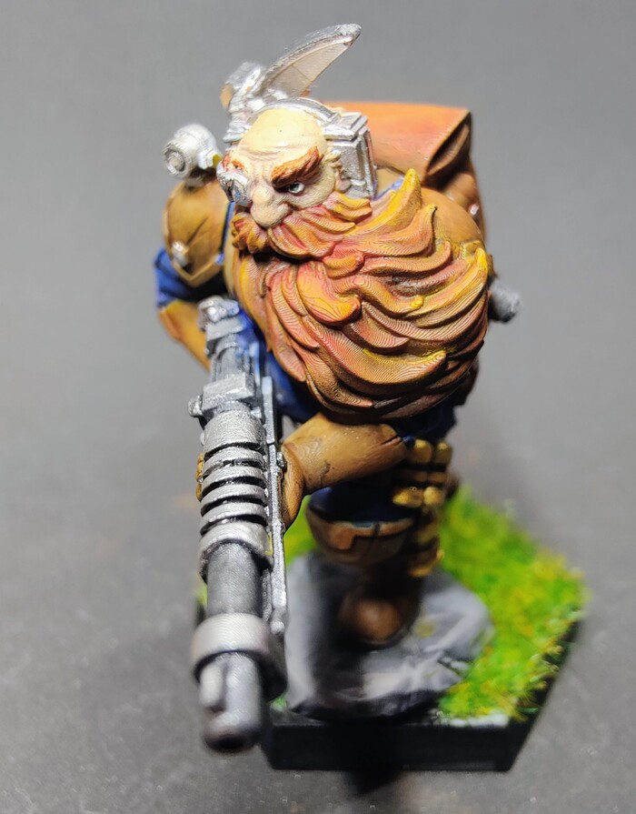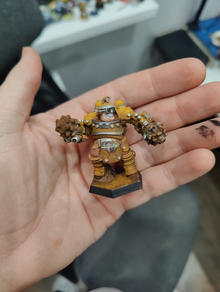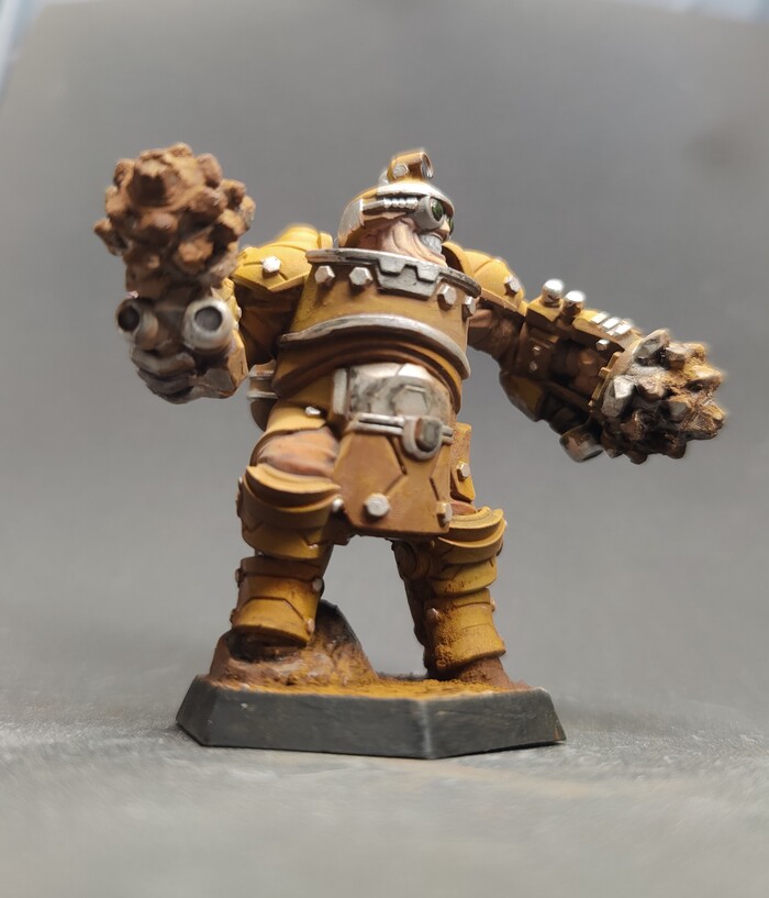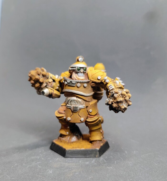 А это дварф-бурильщик, что и видно по его грязным бурам, которые он держит в своих руках. Даже не держит, скорее эти буры вмонтированы в его костюм. Этот дварф любитель грубой силы и взрывчатки.