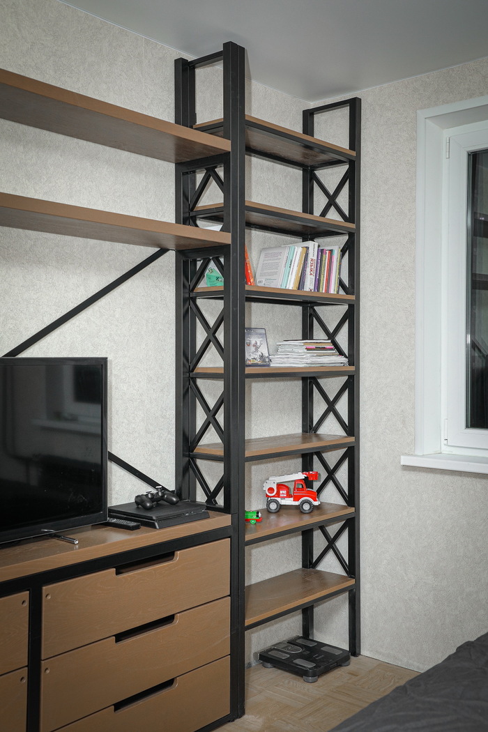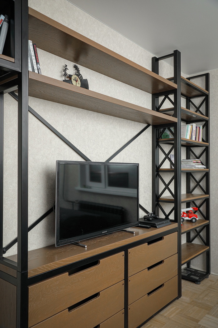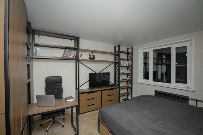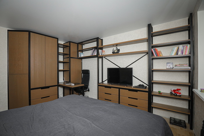 Была поставлена задача в небольшой комнате 3,5Х4,5 поставить мебель в стиле лофт. Чтобы на века: натуральное дерево, металл, и долговечная фурнитура. Компромиссов тут быть не могло.