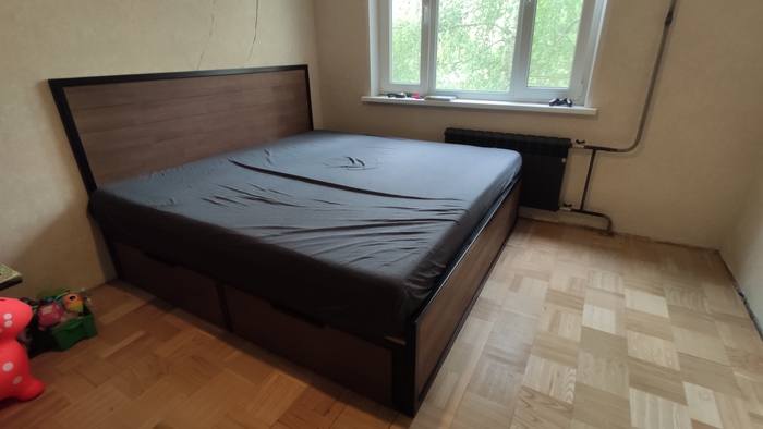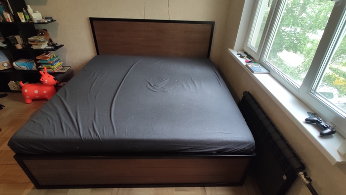 Сначала была изготовлена и поставлена кровать под матрас 2Х2 метра. В кровати имеются 4 выкатных ящика, по 2 с каждой стороны для хранения вещей. Профиль кровати был изготовлен из металлической трубы сечением 40Х40 мм, обшивка из дубового щита. Ящики из 15мм фанеры, фасады ящиков из дубового щита. Покрытие металла – порошковая покраска, покрытие дуба – морилка и лак. Остальную мебель тоже хотели покрыть морилкой, но так как покупали не самую дорогую, то купив того же производителя и того же цвета был шок от полного непопадания в цвет. В итоге ящик морилки до сих пор пылится в мастерской. Вот эта кровать.