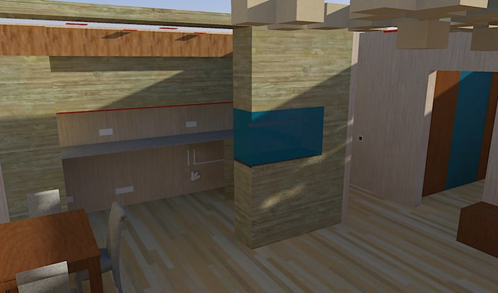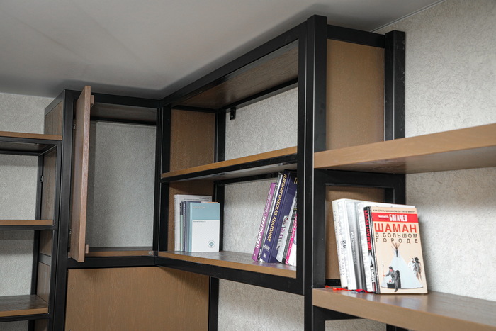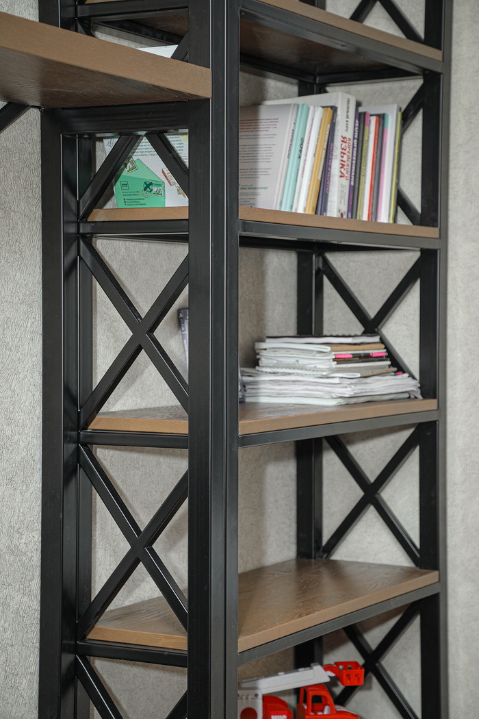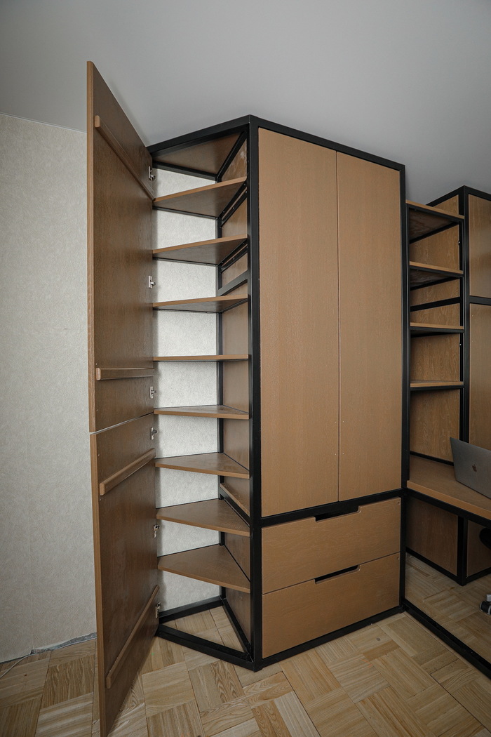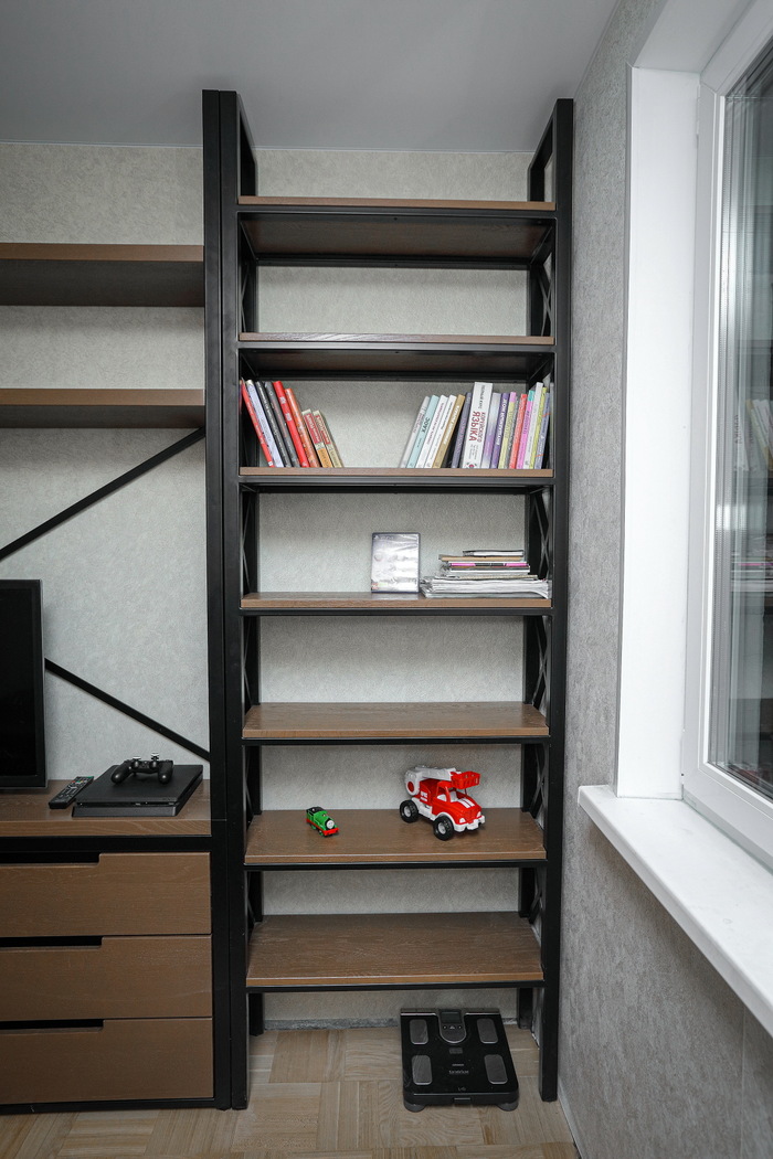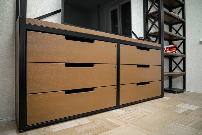 Потом была спроектирована остальная мебель: книжный стеллаж, консоль для TV и Sony Playstation с полками и ящиками для хранения различных вещей, 2 платяных шкафа, в одном из которых есть ящики для хранения вещей, рабочая зона и подвесная полка. Все ящики запираются на ключ (он единый для всех ящиков) для того, чтобы маленький ребёнок не смог их открыть. Материалы: каркас из металлической трубы 40Х40 мм, несколько элементов из трубы 20Х20 мм в порошковой покраске, натуральный дуб с покрытием лазурью, фурнитура Blum.