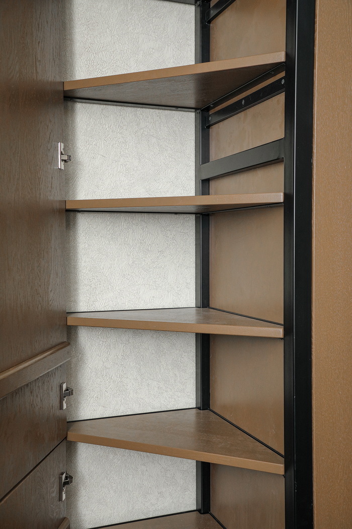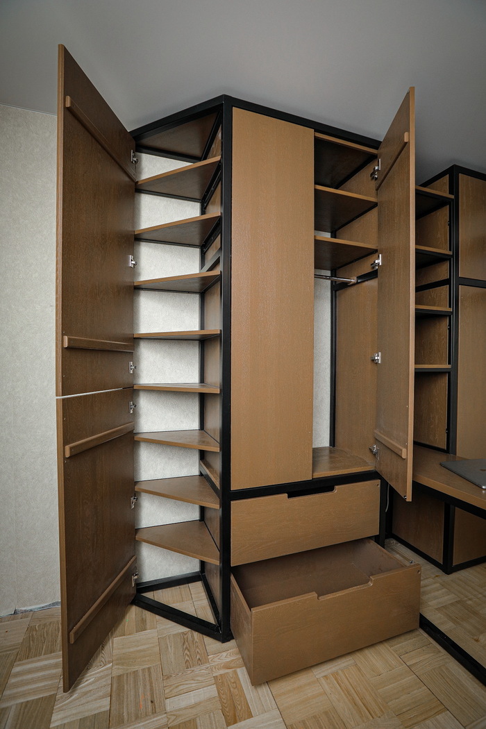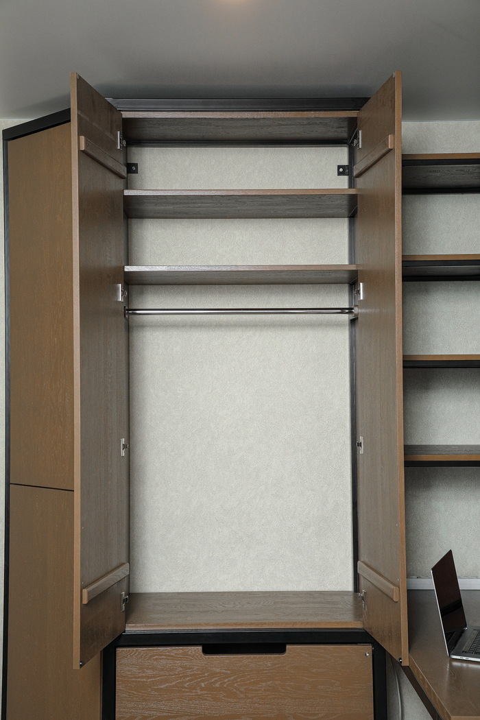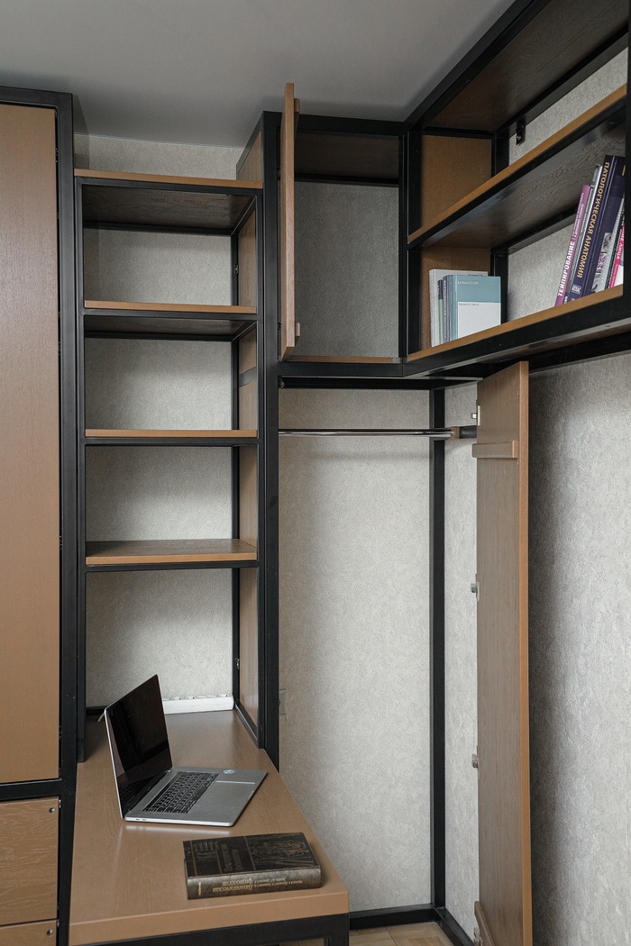 Высота штанг для одежды рассчитывалась на рост заказчика и его супруги. Высота рабочего стола тоже. Дело в том, что в зависимости от роста человека высота рабочей поверхности стола, высота штанги для одежды и некоторые другие параметры мебели могут отличаться. В мебели на заказ таким мелочам нельзя не уделить внимания.