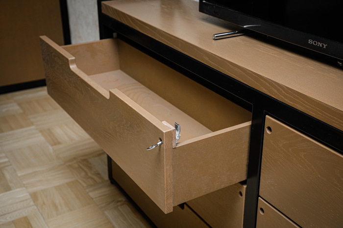 Ящики в большом платяном шкафу, как и под консолью для TV полного выдвижения