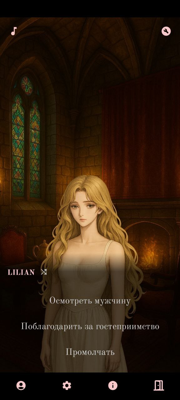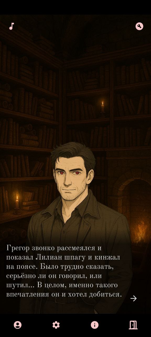 В игре есть два сюжета: подлиннее и покороче. Тот что подлиннее за девушку Лилиан, короткий сюжет за механического Бернарда. В перспективе, есть желание сделать третий за вампира Грегора во времена его юности и устроить сюжеты перекликающимися. Идея в том, чтобы действия в одном сюжете могли менять события и возможности для других. С технической точки зрения реализовать это не сложно, сложно писать сюжет и понять, что должно произойти и где, и как это будет влиять на другие сюжеты, чтобы не ломать логику и не вызывать у игрока чувство несогласия. Для сцен, где не предусмотрена подложка, я использовал процедурную генерацию символов, которую писал вообще для другого приложения, но она очень гармонично сюда легла.