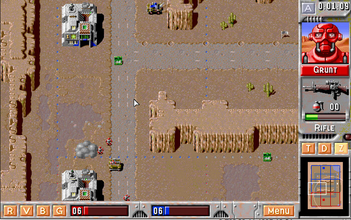 Стратегия про роботов-раздолбаев. Я научился строить что-то, отличное от грунтов и джипов к четвертому уровню. А был товарищ, который с джипами дошел до 12 уровня, матерясь на сложность игры. Здания тут строить не надо, они заранее построены. Карта разбита на квадраты, в центре которых находится флаг. Доходишь до флага — квадрат становится твоим и все фабрики в нём начинают работать на тебя. Плюс от количества квадратов скорость строительства юнитов зависит, отсидеться в обороне и накопить силы не выйдет, надо сразу атаковать.