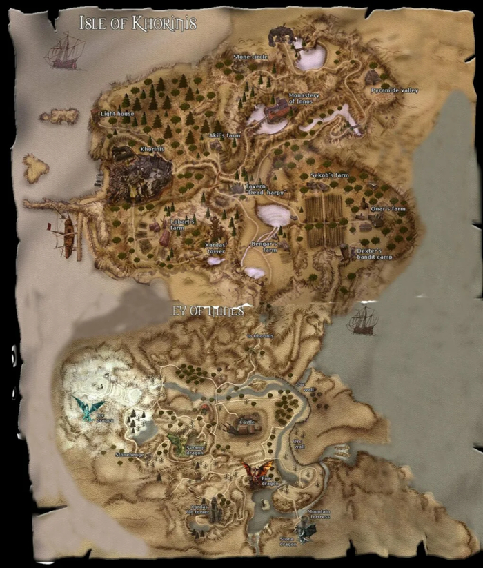 Это был один из первых хорошо проработанных миров, где персонаж мог бы пойти КОГДА угодно и КУДА угодно. Все что тебя останавливало – это монстры, убивающие тебя с одного «куся». Но и мимо них всегда можно было пролизнуть, с 10 попытки найдя тропку, на которой на тебя не агрились, или вовсе пройти в обход по скалам. На начальных уровнях главной проблемой в таких ситуациях было выйти с локации, в которую ты как-то забрался, целым и невредимым. Да, кстати. Карты в начале игры у игрока нет, тебе просто говорят: «Иди туда». И ты идешь, а игра вознаграждает тебя за исследование: заберись на плато на скале и найди оружие получше, или хотя бы просто собирай травы, которые тебе потом очень пригодятся по игре.