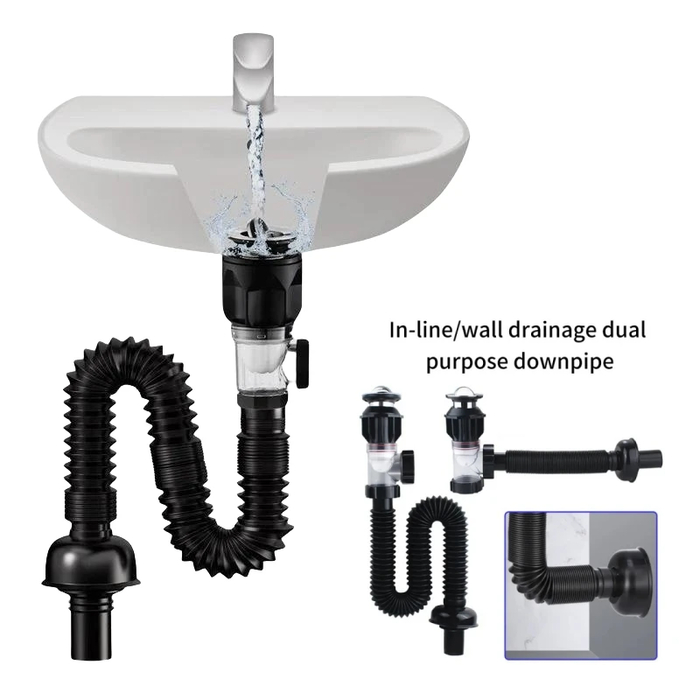 Сливная труба из АБС-пластика легко изгибается в любую сторону, что упрощает установку и экономит пространство под раковиной. Система оснащена компонентом, предотвращающим обратный ток воды и неприятные запахи из канализации. Силикагелевые прокладки обеспечивают герметичность соединений. Подходит для ванных комнат, кухонь и автофургонов.