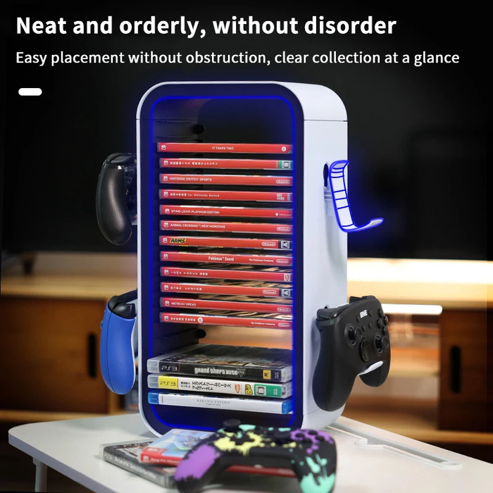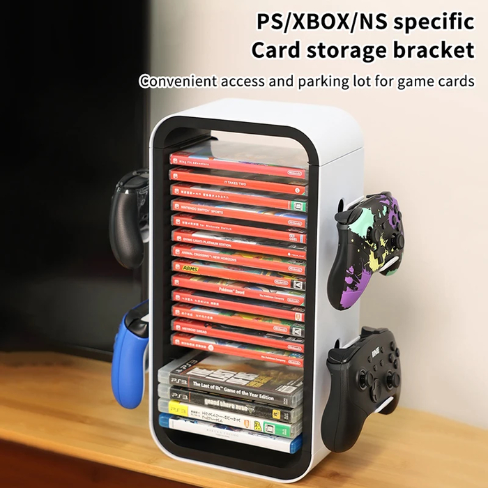 Универсальная система хранения для игровой периферии, совместимая с контроллерами PS5, PS4, PS3, Switch и другими геймпадами. Вмещает до 18 дисков с играми в специальных слотах, предотвращая их потерю и повреждение. Конструкция оснащена устойчивыми кронштейнами для надежного удержания до четырех контроллеров одновременно.