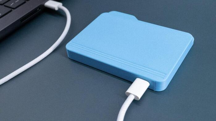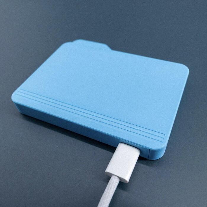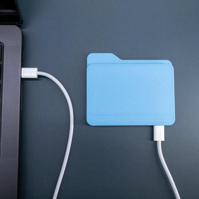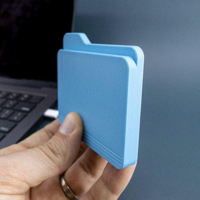 При подключении к компьютеру Mac накопитель отображается на рабочем столе тем же значком синей папки, что и его физическая форма, создавая визуальное единство между реальным устройством и его цифровым представлением.