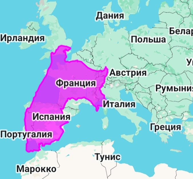 Или вот так Перу будет выглядеть на карте Западной Европы, полностью заняв территории Франции и Испании.
