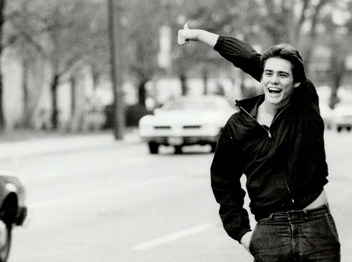 Юный и жизнерадостный Джим Керри ловит попутку на дороге, 1981 год.