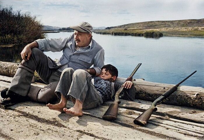 Эрнест Хемингуэй с сыном. Один из лучших прозаиков США. Золотая классика этой страны. Эрнест страстно любил охоту. Охотился с помощь лука, копья и реже - ружья. Был неплохим боксёром. Участвовал в Первой Мировой. Был серьёзно ранен (27 осколков). На войне ему прострелили коленную чашечку, позже оперировали в Милане. Спустя 12 лет, он попадёт в автомобильную катастрофу, но останется жив. Травма головы и куча переломов. Затем воевал в Испании во время Гражданской. Во Второй Мировой участвовал в боевых полётах в Европе. Затем был в пехоте. Прожил 62 года, написал кучу интересных произведений, вписав своё имя в историю мировой классики.