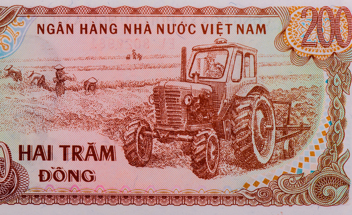 Да-да, тот самый советский трактор "Беларус" (МТЗ-52). На купюре 200 донгов красуется "наш работяга". Здесь в общем-то всё просто. Вьетнамцы начали покупать наши трактора, чтобы восстанавливать страну и сельское хозяйство. Дешево, сердито и эффективно. 200 донгов - это очень и очень скромная сумма даже по сегодняшним меркам (66 копеек), а к советскому рублю и вовсе микроскопическая, тем не менее, для простых людей это была ходовая купюра в тяжёлые послевоенные времена. Вот на неё и нанесли трактор. Есть версия, что как символ труда и надежды на возрождение страны.
