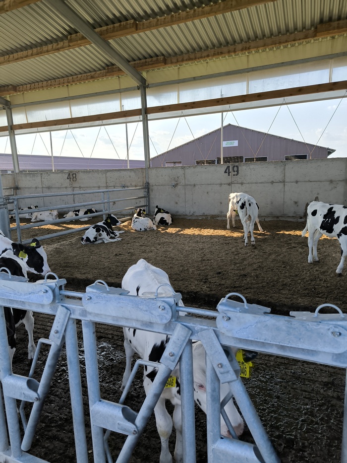 Также нам показали счастливых коровок вне стойл, которые просто живут на воздухе и общаются. Это коровы, которые ещё только готовятся стать мамами - им нет года или их только оплодотворил, или они беременны. Беременность длится 9 месяцев.