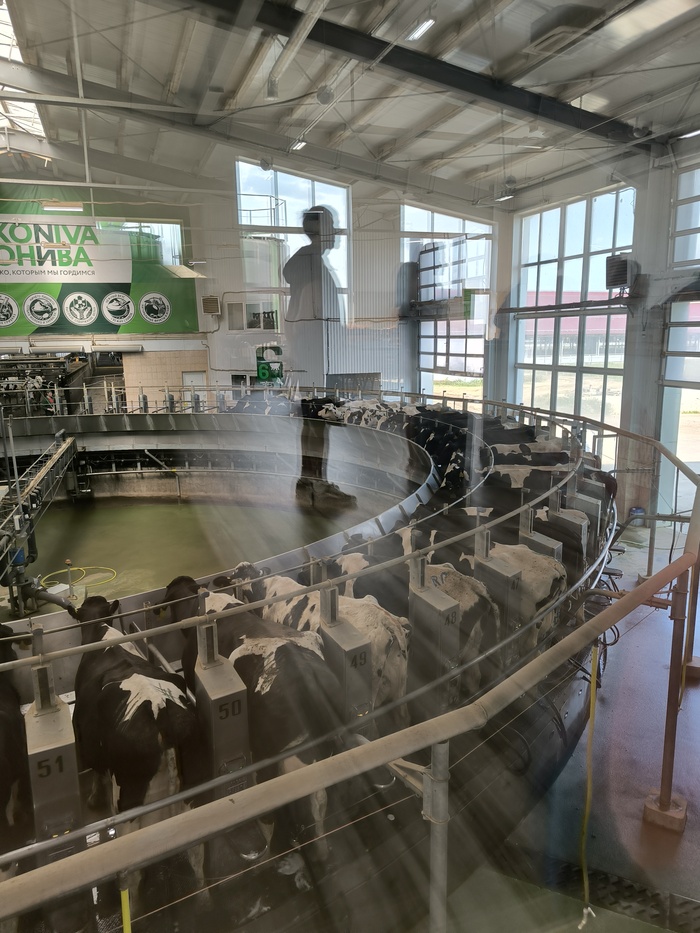 Экскурсия началась с того, что нашу группу (около 20 человек) посадили в автобус, далее передвигались по территории, как на сафари 🐄. Первое, куда нас привезли, был туалет, где мы помыли руки и только потом вышли в дегустационный зал со столами и огромным прозрачным стеклом, и там мы наблюдали, как осуществляется промышленная дойка коров. Коровы заходят на карусель, к ним быстро подключают аппарат для дойки, и далее коровка 7 минут стоит на карусели пока та делает свой круг, корова выходит с карусели сама, а аппарат остаётся внутри, выпадает автоматически с вымени. После каждой коровы отсек моют люди - все чистое.