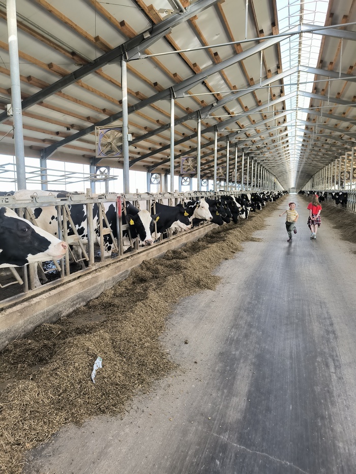 Далее едем к взрослым коровам. Моё потрясение - тут очень чисто, вообще нигде нет мошкары, и дышать легче, чем в некоторых офисах - постоянно работают мощные вентиляторы, которые разгоняют запахи, коровы тоже живут вместе, общаются, опять же никаких тебе слепней, продукты жизнедеятельности убирают несколько раз в день специальными машинами.