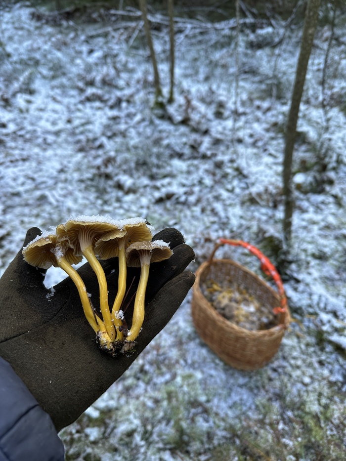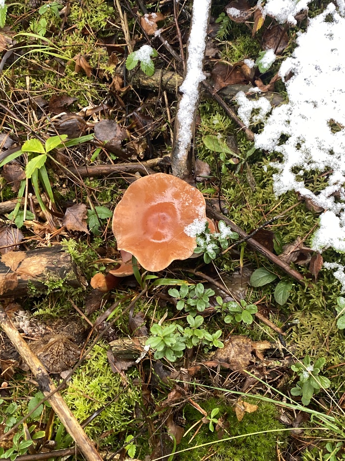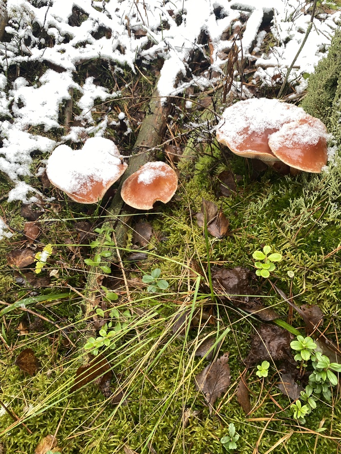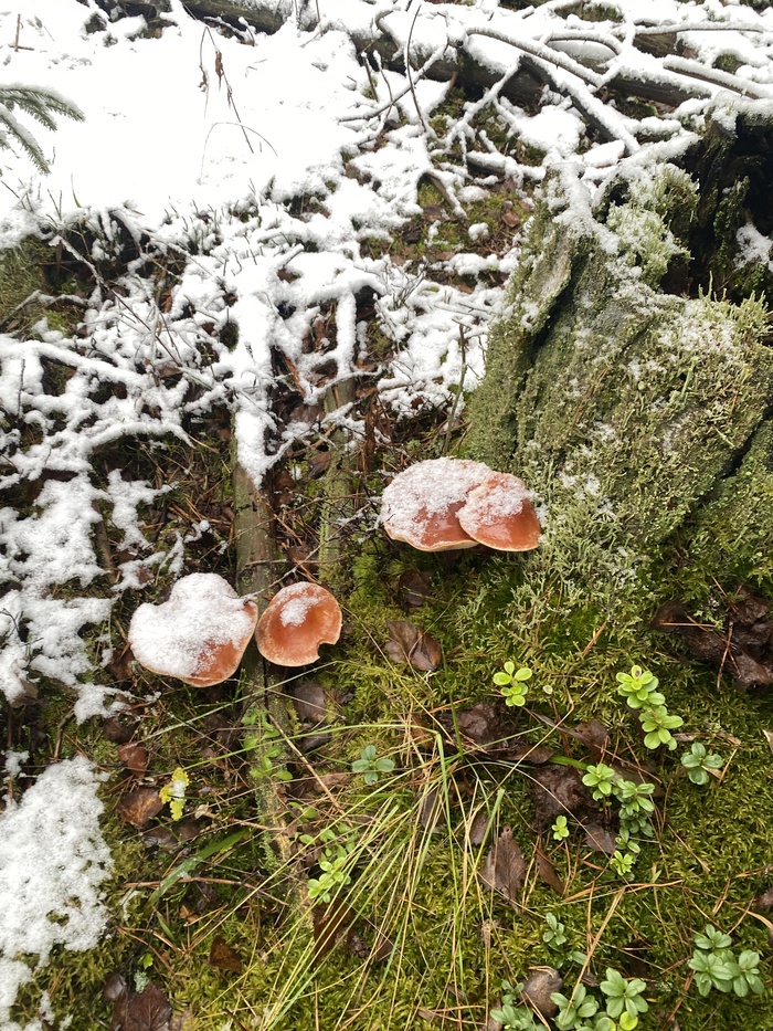 Гуляли по лесу, встретили вот такую красоту, конец ноября, снег вчера выпал, ночью за бортом -5 градусов. А эти выползли, красивые крепкие, шляпки сантиметров 12 в диаметре, срывать естественно не стали, потому что, не знаю что за грибочки.