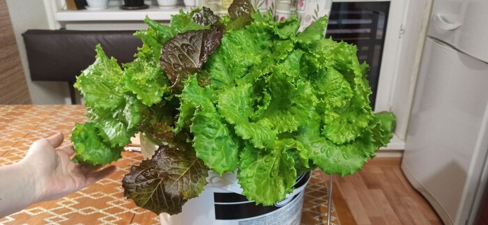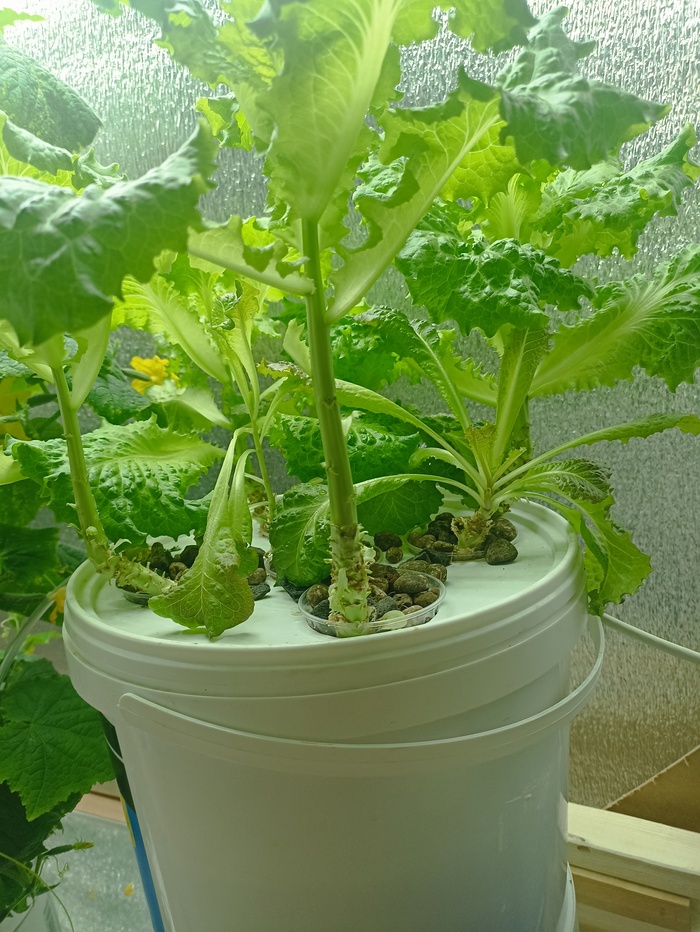Гидропоника. Салат рос 2 месяца. Было 3 сорта. Самый дешевый оказался самым неприхотливым и урожайным. Раз в неделю обрывал сильно,оставлял 2-3 листа. . Отростает заново. Далее буду выращивать салат на про точке. Теперь внимание на огурцы.
