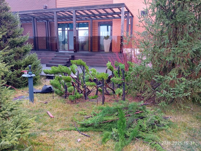 В целом, на стрижку 5 туй высотой 4 м ушло 4 часа. И ещё час на поддерживающую стрижку 5 можжевельников по 3 м)