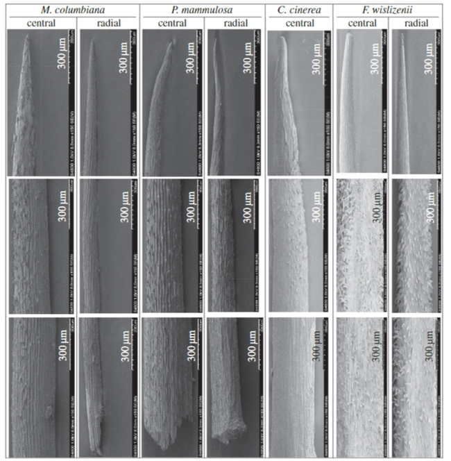 Микроструктуры шипов были исследованы с использованием изображений СЭМ и измерений шероховатости поверхности (R a и R z), полученных от шипов C. cinerea. Было установлено, что существует градиент шероховатости, созданный сужающимися микрорезьбами, который потенциально может направлять поверхностную воду от кончика шипа к его основанию.