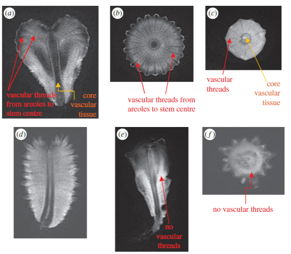 (c) поперечное изображение сверху вниз C. cinerea, показывающее изменения в плотности от ареол до цилиндрической сердцевины сосудистой ткани и центральной сердцевины,