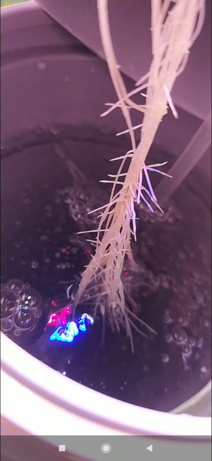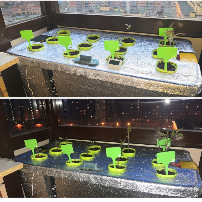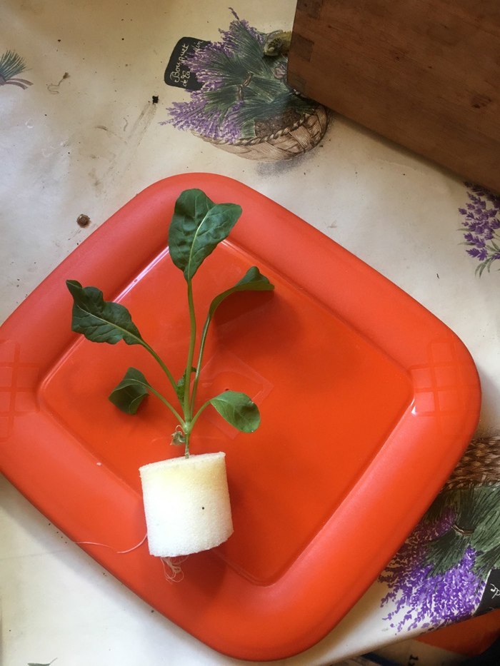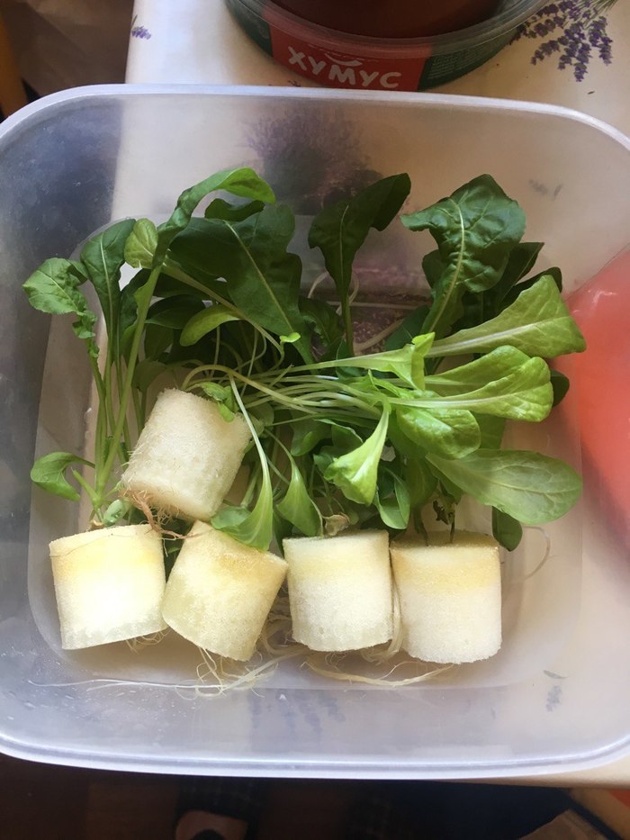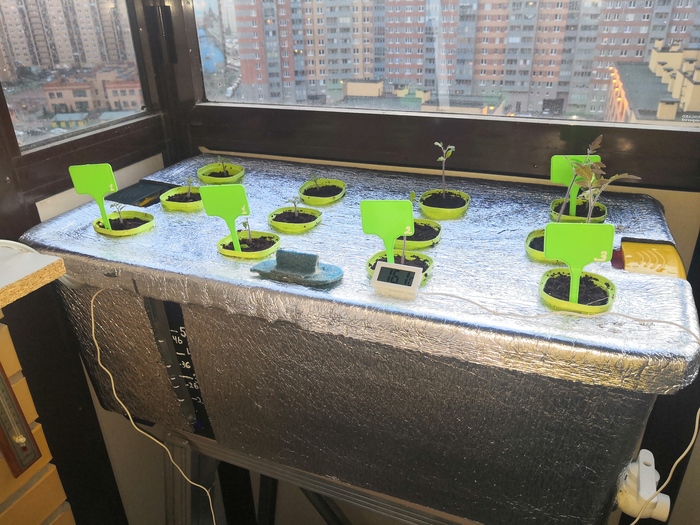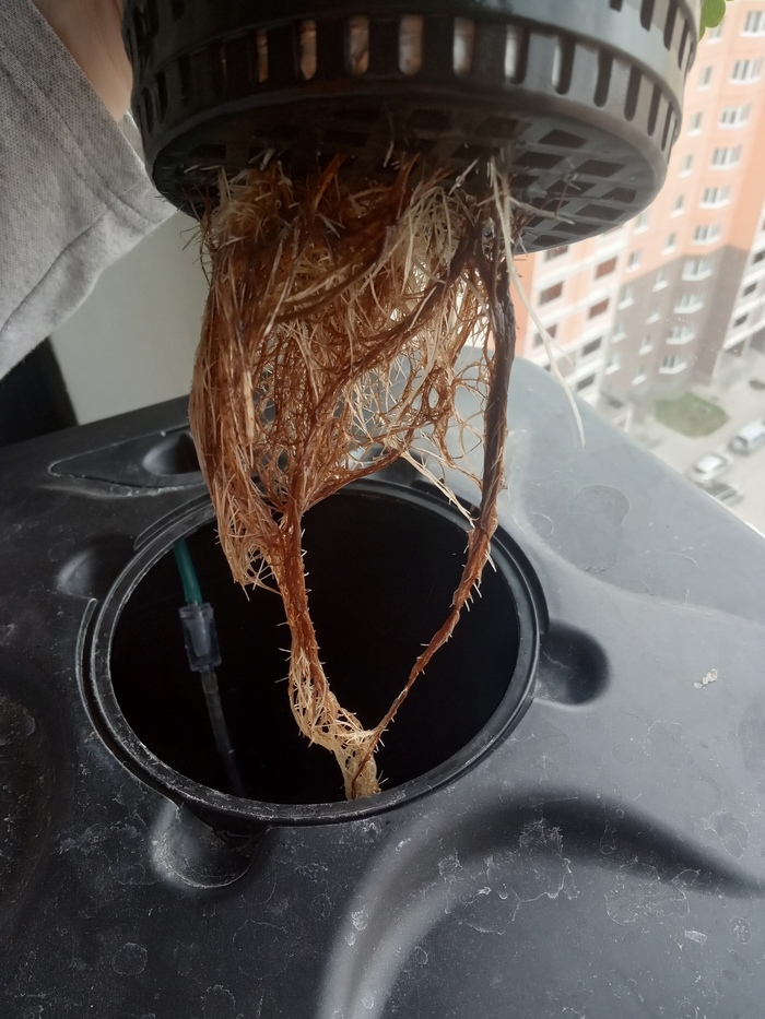 Предварительно поместил веревочки-фитили в горшки и протянул их через дно наружу. Поставил в контейнер со слабым питательным раствором. Таким образом, первые дни ростки питались через фитили, поглощая воду и питательные элементы. Это называется фитильный способ гидропоники. Дело в том, что просто в воду ставить нельзя, так как субстрат был бы чрезмерно влажным, и кислород недостаточно поступал к корням.