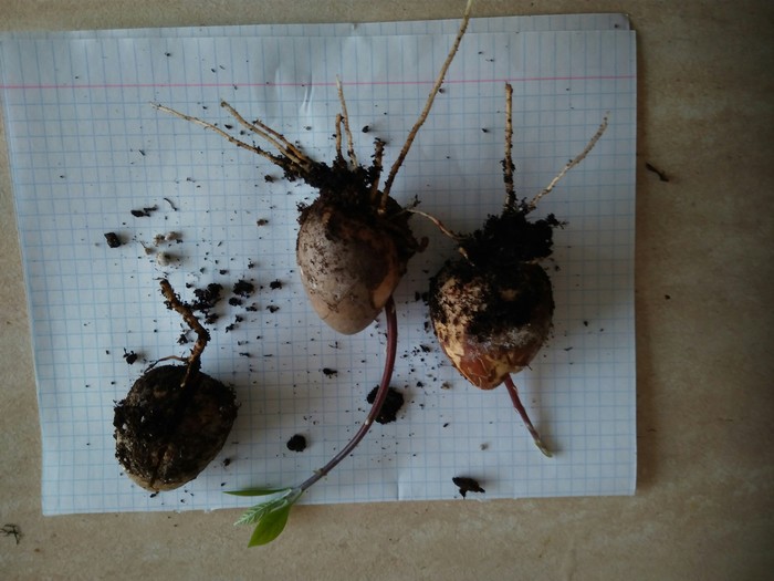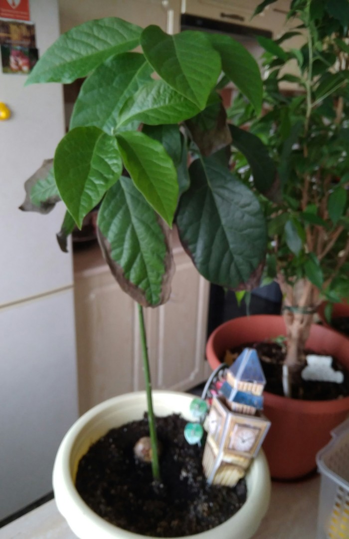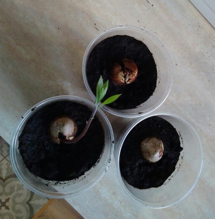Во всех горшках-косточки авокадо(собственно-оставшиеся после употребления самого фрукта))). Их я туда воткнула месяца 1,5 назад-примерно столько времени у меня обычно уходит на проращивание. Полив-вместе с основным цветком, особых секретов нет. Осторожно, выкручивающими движениями, извлекаем косточки из земли.