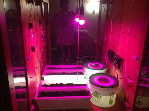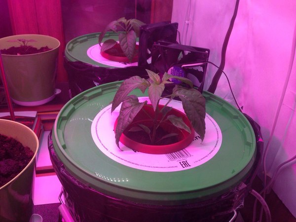 Насмотрелся на ютубе видосов. Всё очень авторитетно и дорого. Отдельное спасибо dzagigrow и gorskoff ну и заморским гроублогерам. Денег не было от слова "почти". Так что взял я дрель, отвёртку, землю, керамзит и два горшка под рассаду. Фитолампочку прикупил в мурлене на 9w. Ну и ради эксперимента решил засадить DWC-гидропонику (пластиковое ведро+горшочек+кокосовый грунт оттуда же). Пару старых и почти дохлых кулеров от компа накрутил соплями на шнурки от старых девайсов и воткнул в usb зарядник. Получилось вот что.
