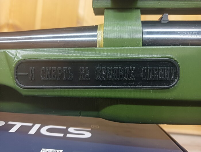 Оптика х1-х4. Не люблю колиматорные и голографические прицелы. (Спереди также предусмотрена планка под сошки, но не знаю, нужны они будут или же нет. Не мешают по крайней мере.) Кронштейн для оптики с планкой крепится за ствол и за точку крепления на ложе. Впаяны гайки, резьбовое соединение (кроме шильдика -- никакого клея). Ожидаю отсуствия люфта всё-таки. Никакого необратимого внесения изменений в конструкцию не было.