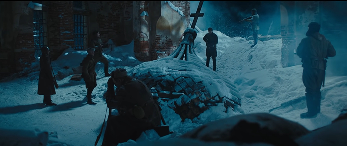 Прока комбат пьет водку и разглагольствует, немцы по полю тихонечко ползут в сторону деревни, а дозоры из советских бойцов, тихо в окопах спят на морозе. В церкви в это время, продолжается спор и юный пионер говорит, что немцы к советским жителям относятся лучше чем советское руководство, отвело жителей деревни подальше от боевых действий в немецкий тыл. Политрук норовит расстрелять за такие слова пионера и говорит, что немцы угнали жителей деревни на рабский труд в Германию.